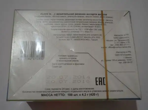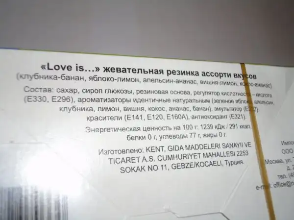 Вчера ходил по оптовому гипермаркету, и увидел блок жвачек "Love is Ассорти" и не смог удержаться от покупки, тем более цена была 300 рублей! Взял этот блок в руки и провалился в то время, когда ещё ходил в школу и клянчил деньги у родителей на очередную жвачку или шоколадку... Да, это тот самый "Love is" с самым, что ни на есть, - САХАРОМ!!! Сейчас уже ни в одной "жуйке" нет этого ингредиента, только сахарозаменители, сорбитолы всякие... Да, тут тоже есть красители и ароматизаторы, но этот вкус ни с чем не сравнить и не перепутать! Смотрим, читаем, осмысляем: