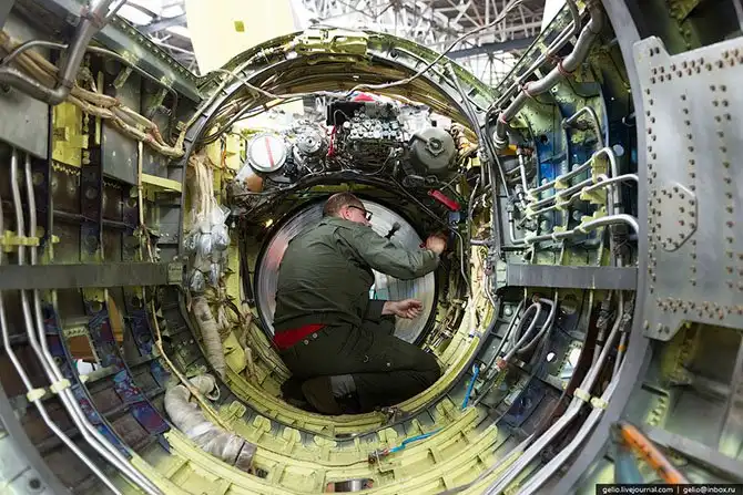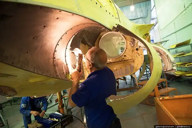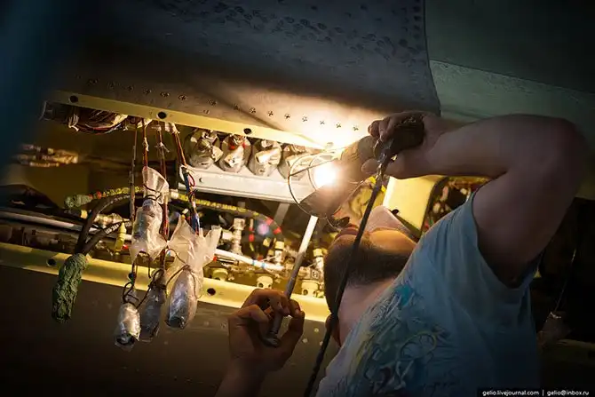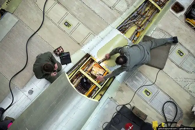 Большая часть работ выполняется вручную. Зачастую работать приходится согнувшись в три погибели внутри фюзеляжа.