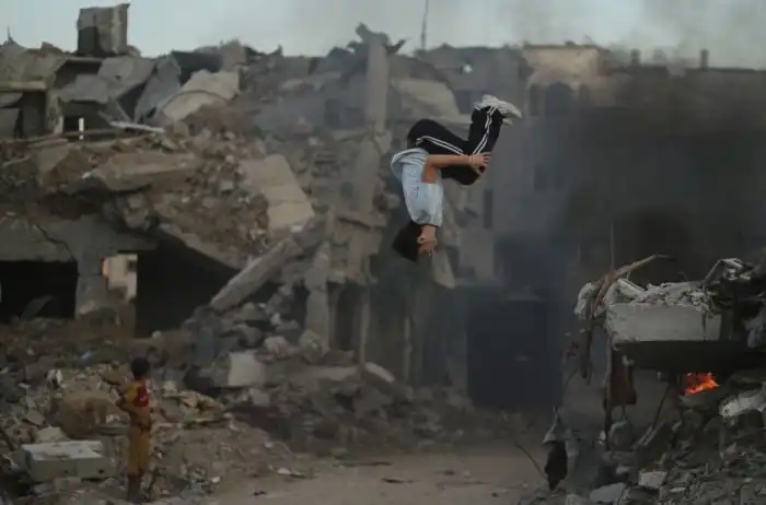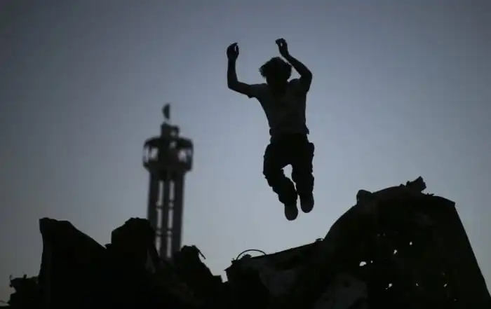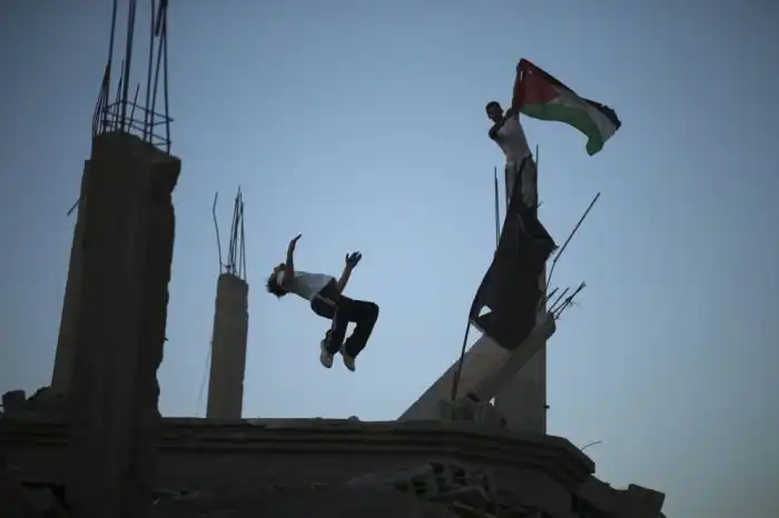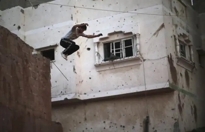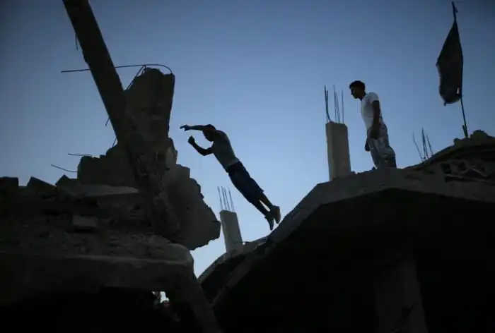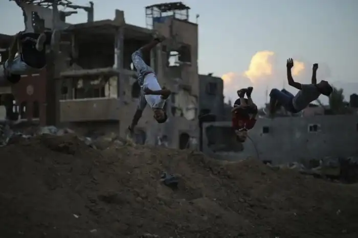 Один из фотографов агентства Reuters заснял подростков, живущих в секторе Газа и занимающихся паркуром на свежих, еще дымящихся руинах.