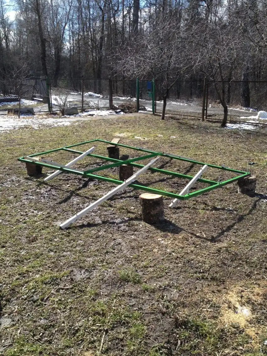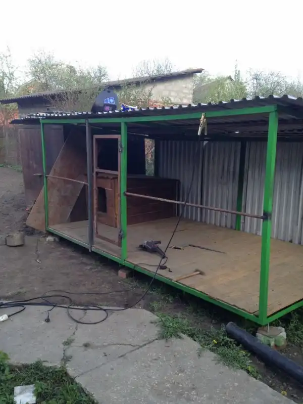 После сварки каркаса, естественно сразу же покрасил. Ставлю себе задачу на следующие выходные делать кровлю. К счастью, опять-таки есть металлопрофиль, типичный цинковый. В самый раз на будку собаки. Мудрить со стропилами не стал (а зря) положил на основание четыре доски (25х150) это и были стропила. В итоге конструкцию укрепил, сделал жестче. На ветру не парашютит, крыша мой вес (85 кг) держит. Считаю, что зимой снег выдержит.