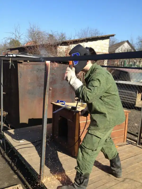 И вот, наступили очередные выходные и нужно двигаться дальше. Отрезав нужное количество уголка, вымерив высоту и ширину, решили варить стойки вольера на месте. Где-то металл не хотел вариться где-то залипало...в общем научился варить только к концу постройки.
