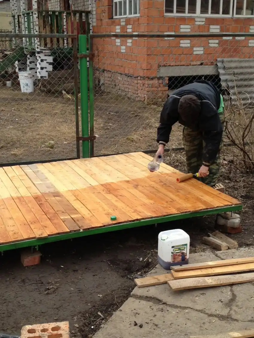 После того, как пол был застелен, было принято решение отнести потенциальный вольер на место своего постоянного пребывания. ДЛя того что бы дерево не гнило и было устойчиво к природе, нужно было его бработать специальным средством, которое опять-таки было в наличии.