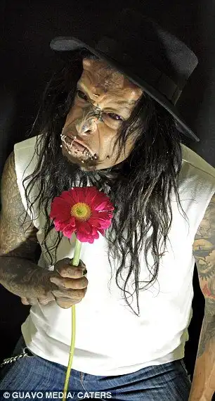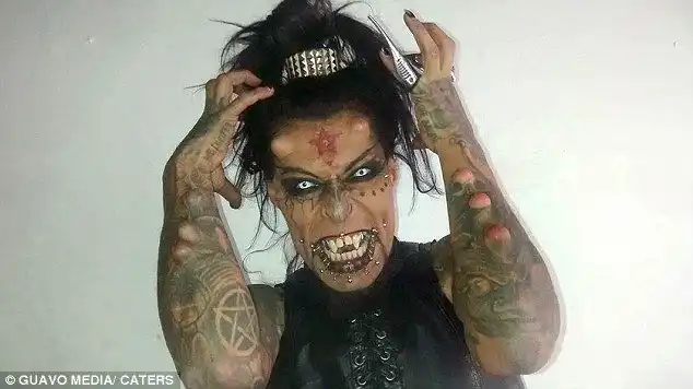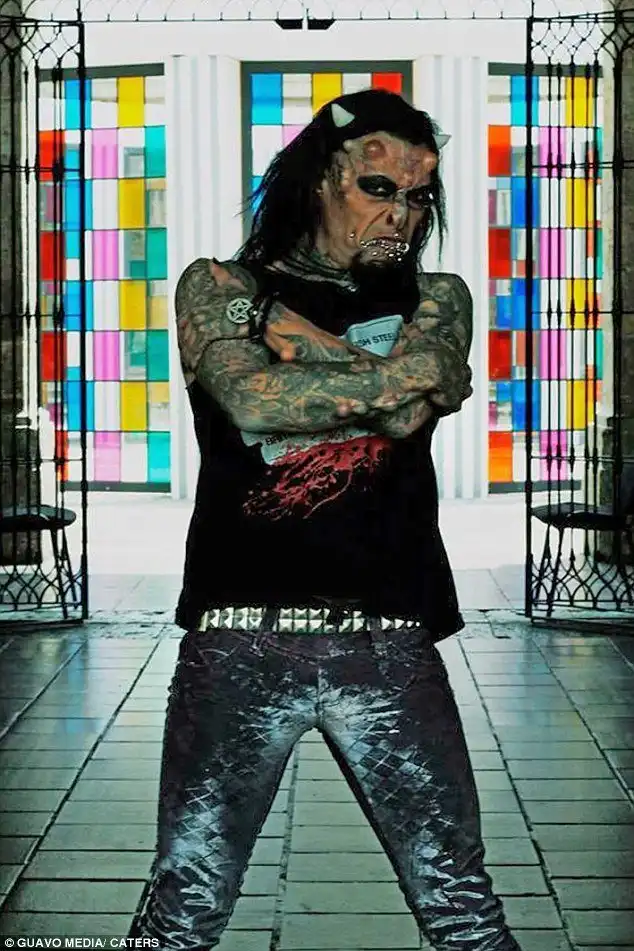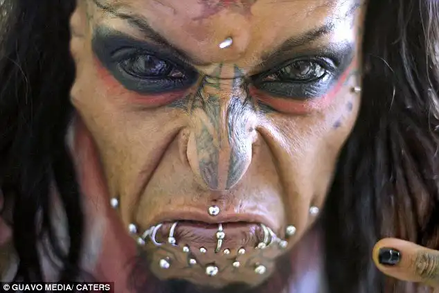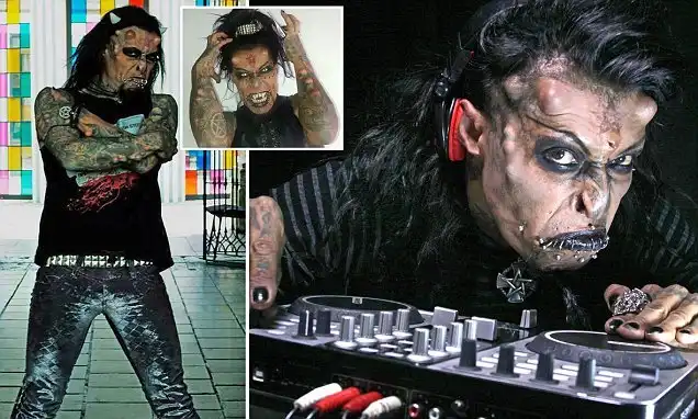 42-летний Caim Mortis потратил 11 лет на преобразование своего тела, у него глазные яблоки татуированы черным цветом, в лоб вставлены импланты в виде рогов, также татуировки и пирсинг по всему телу.