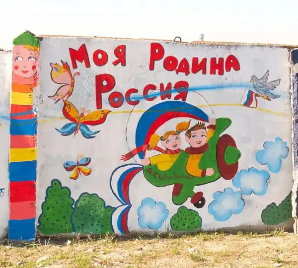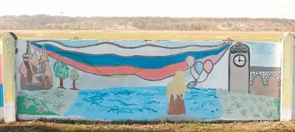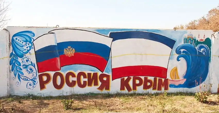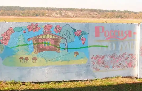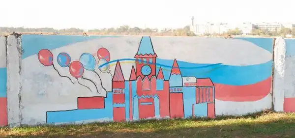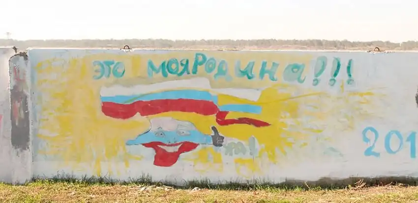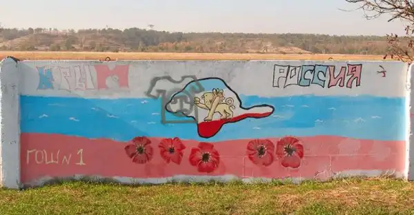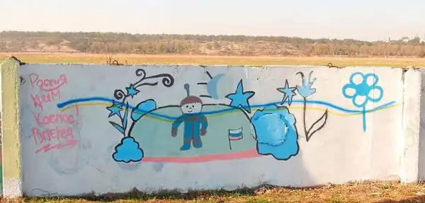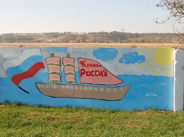 На бетонном заборе вдоль дороги неподалёку от аэропорта в Симферополе