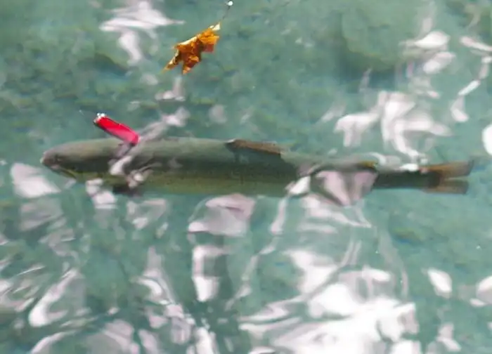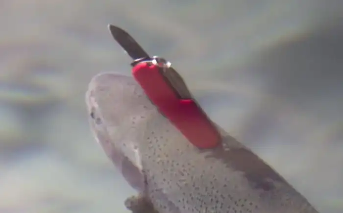 Вот такую форель с торчащим из нее складным ножом обнаружил в горном озере Швейцарии автор этих фотографий.