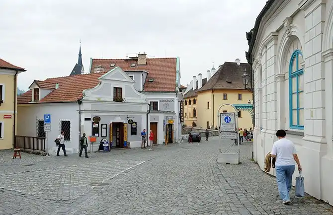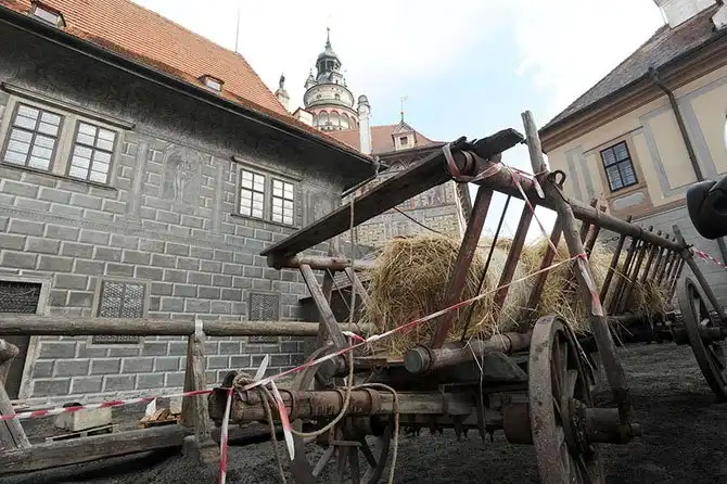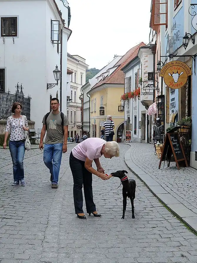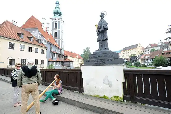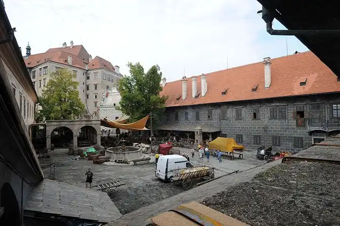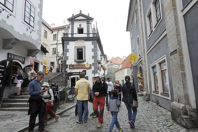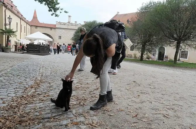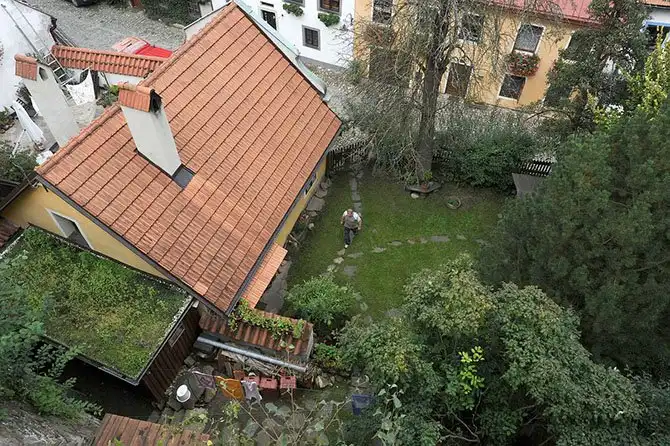 Обычно экскурсия начинается со смотровой площадки, с которой видно весь город. А пока слушаешь историю Крумлова, можно заглянуть в частный дворик. Товарищу явно не до туристов — «все больше по хозяйству».