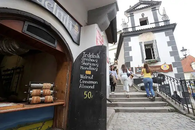 На улицах Крумлова, как и в Праге, часто встречаются палатки, в которых выпекают на открытом огне булки Trdelník или чеш. Staročeské trdlo — тесто, накрученное на скалки и обвалянное в орехах и сахаре. 50 крон все удовольствие, но вкусно невероятно.