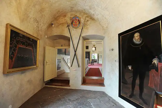 Дорога в замок начинается с каменного моста, украшенного скульптурами Девы Марии и Святого Йозефа.