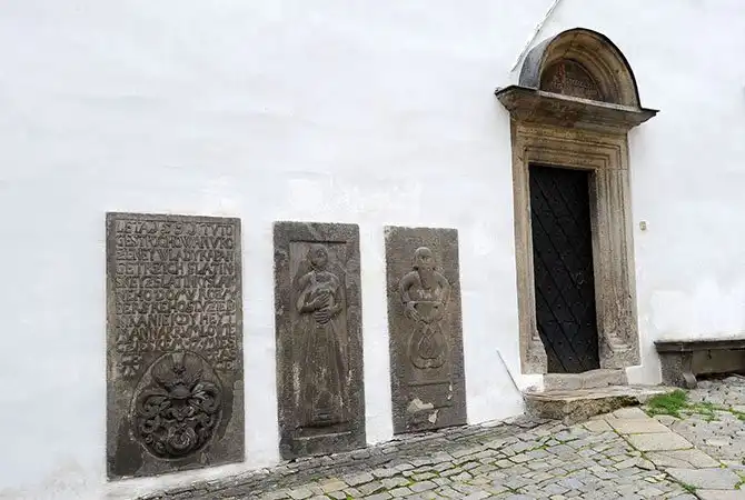 С этими плитами в стене напротив церкви связана легенда: дом мельника и его семьи попросила для своих нужд церковь. Мельник согласился отдать дом с условием, что, когда он и его родные умрут, священники будут служить по ним поминальные службы. Но однажды молодой священник забыл это сделать, и призраки мельника и его семьи явились к нему прямо в костел. Священника нашли утром мертвым. (Есть самое настоящее свидетельство о смерти священника от разрыва сердца.) Чтобы как-то успокоить души умерших, их надгробные камни замуровали в стены дома, чтобы священники больше не забывали о своем обещании.