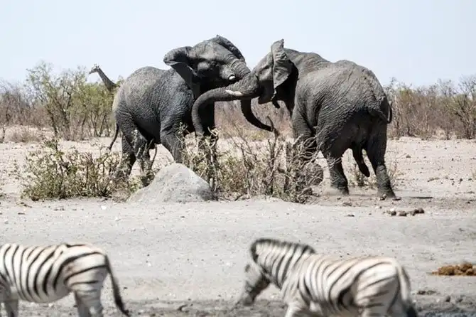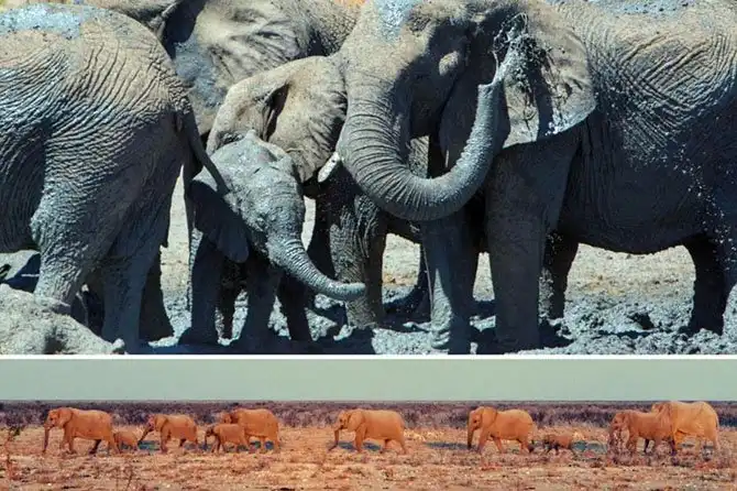 Популяция слонов впечатляет в парке Этоша. Сплошное удовольствие видеть, как они валяют друг друга в грязи для защиты от солнца и путешествуют по всей стране после заката.