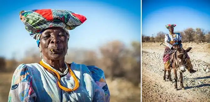 От парка Этоша мы поехали на север к границе с Анголой, и стиль одежды людей начала меняться. Видимо, когда прибыли немецкие колонизаторы Намибии, коренные жители позаимствовали элементы их стиля одежды, и результат получился уникальным и красочным.