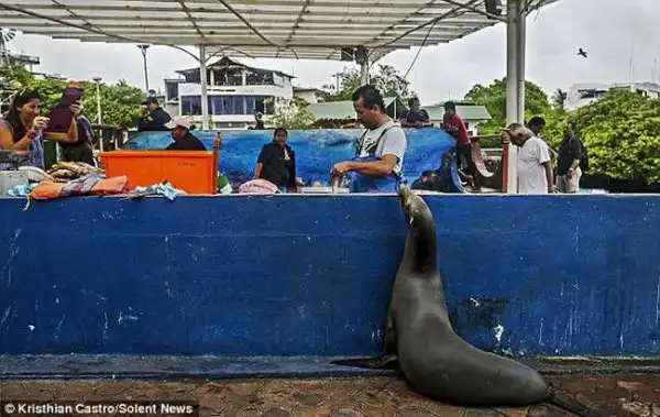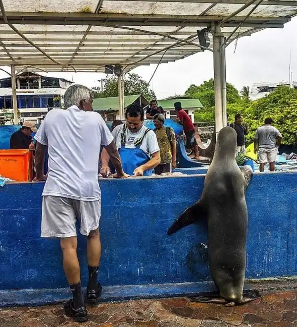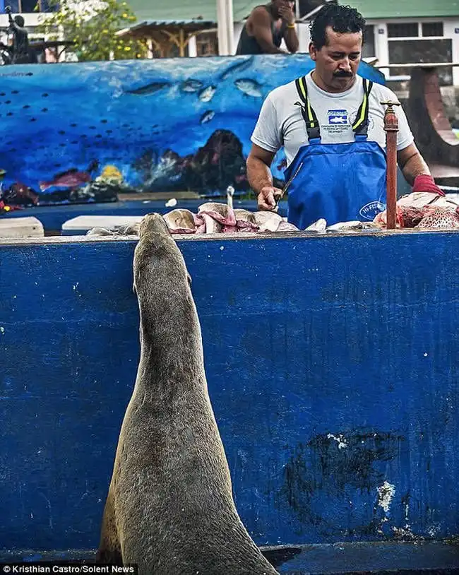 Продавец рыбы на острове Санта-Круз уже успел привыкнуть к частой гостье из океана. Морская львица почти каждый день приползает к его прилавку и ждет рыбных угощений.