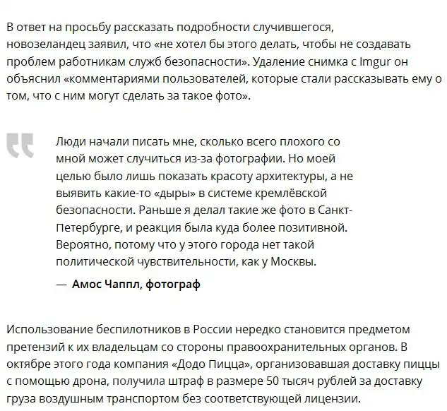 Новозеландский фотограф Амос Чаппл (Amos Chapple) удалил фото Красной площади и Кремля, которое он сделал с помощью бесполитника. На хостинге Imgur снимок пробыл всего лишь один день. Подобное действие связано с возможными действиями российских спецслужб.
