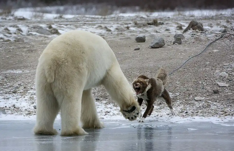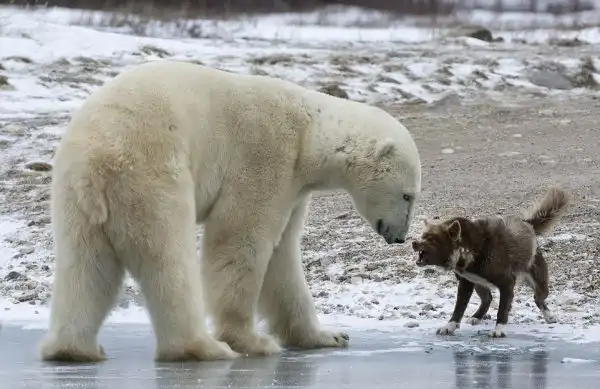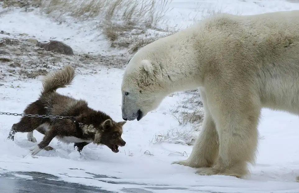 Здоровенный белый медведь подошел к ездовой собаке, но та не испугалась и начала нападать на медведя. Мишка то ли испугался, то ли был шокирован таким поворотом и отступил. Эти кадры снял итальянский фотограф Alberto Panizza в Канаде.