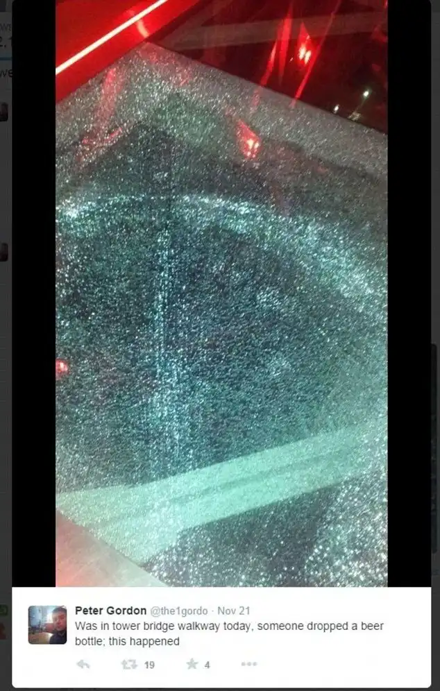 Открытый после реконструкции в начале этого месяца Тауэрский мост, являющийся одним из символов Великобритании, столкнулся с первой проблемой – разбитым стеклянным полом. Один из посетителей уронил бутылку с пивом на 500-килограммовый пролет стеклянного пола, по которому пошли трещины.