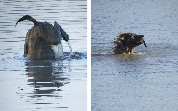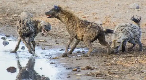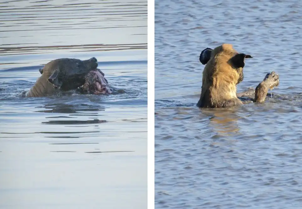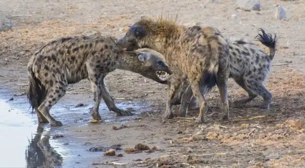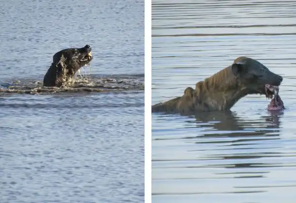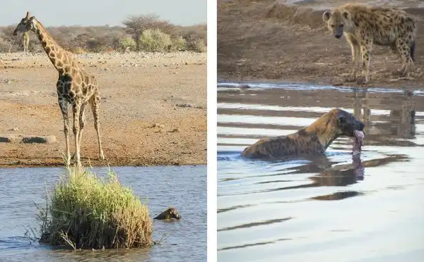 Казалось бы, гиена ловит рыбу, но нет, она ныряет целенаправленно, хочет что-то достать. Оказалось, гиена спрятала мясо под водой от других хищников. Эти кадры сняла Anja Denker (46) на водопое Этоша, Намибия.