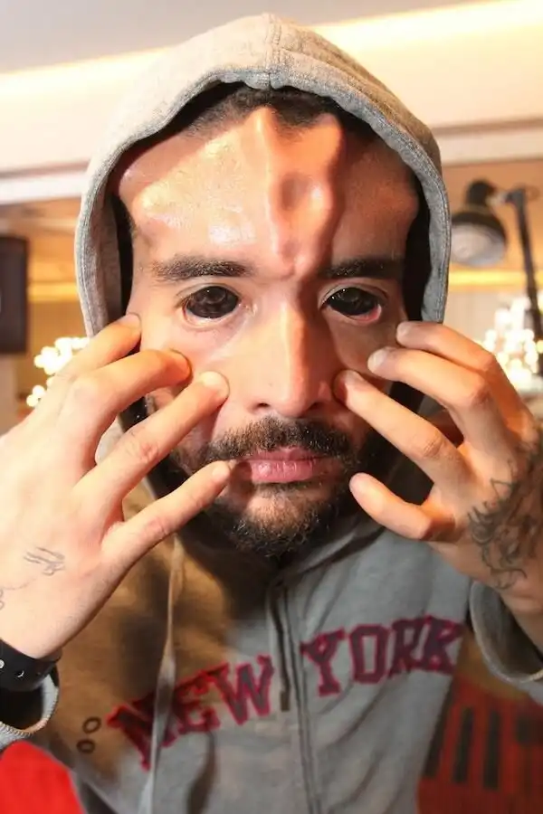 Он ступил на скользкую дорожку модификации тела два года назад и за это время превратился во что-то непонятное. Последняя его операция - удаление носа. После нее он стал выглядеть как отдающий концы сифилитик. Ребенок будет гордиться папой когда подрастет.