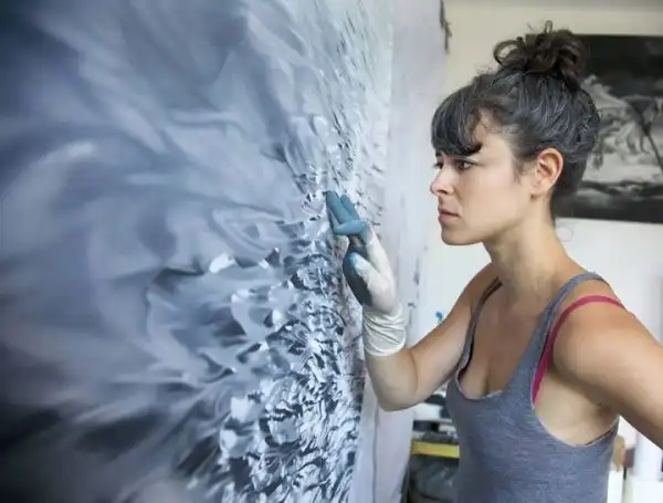 Работы Форман отличаются крупным размером, обычно на всю стену, а фотореалистичного эффекта она добивается, рисуя их пальцами.