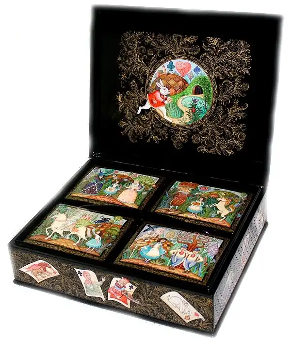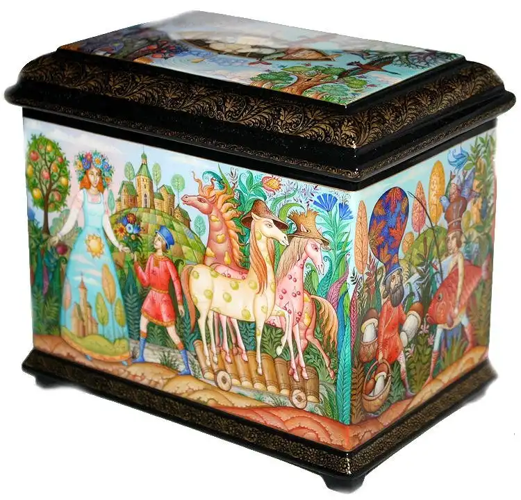 Эти лаковые миниатюры нанесены на шкатулки. На одной шкатулке - пять миниатюр. А в шкатулке могут быть другие шкатулки.