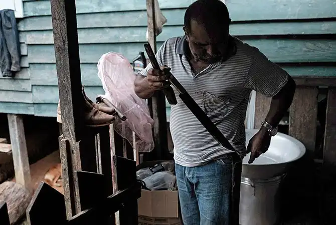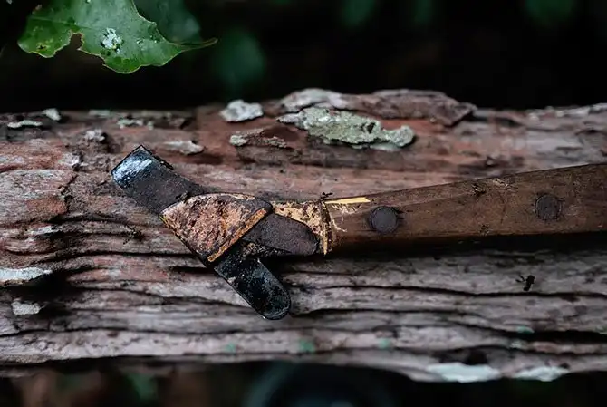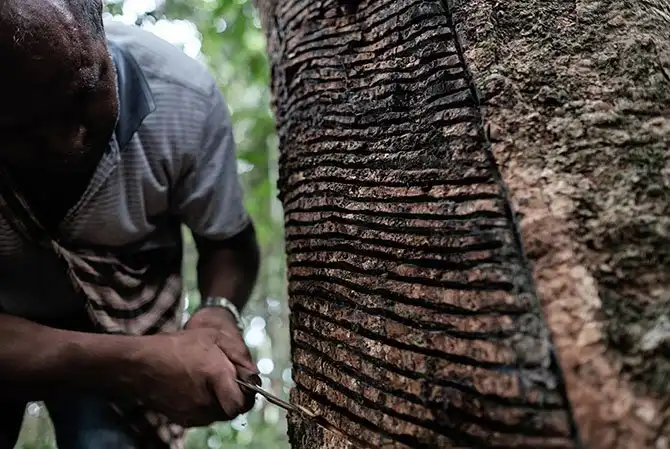 Раймундо делает надрез на коре, чтобы собрать сок.