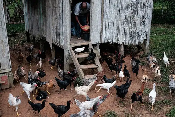 Перейра кормит цыплят перед отправкой на работу — в лес.