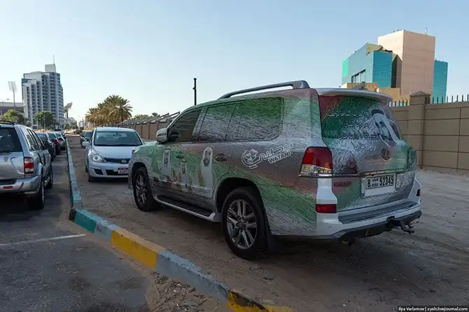 2 декабря Эмираты празднуют день независимости от Великобритании. В этом году было 43 года. В честь этого знаменательного события у местного населения наблюдается небывалый прилив патриотизма. Все машины раскрашивают в цвета флага и лепят везде портреты шейхов.