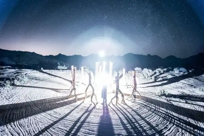 На фотографии изображена инсталляция, которая расположена в Калифорнии, где проводятся различные ритуалы, преследующие всевозможные цели. Автор снимка, ведя переговоры с коллекционером, пошутил, что не продаст фото, если не будет добавлено еще 10 центов. Однако покупатель воспринял это всерьез и выписал чек на 6,5 миллионов и 10 центов, поставив после последнего ноля смайлик. Сам Джеф Фрост называет подобное счастливой случайностью.