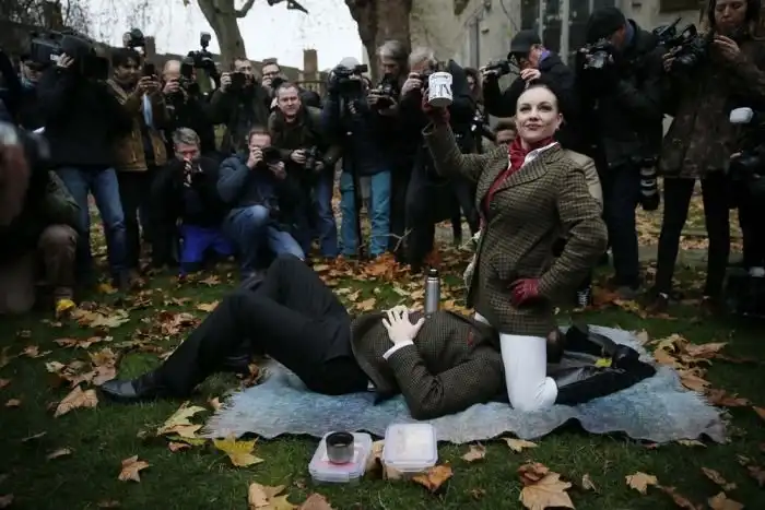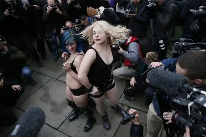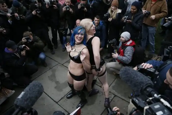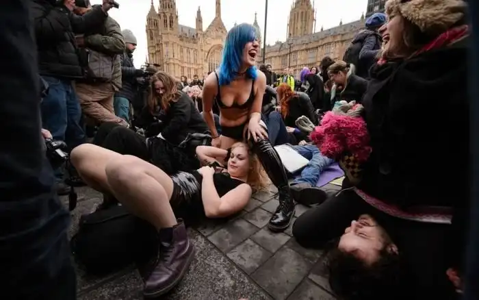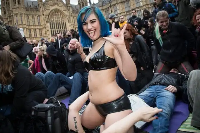 Перед зданием парламента Великобритании в Лондоне прошла акция протеста против введения новых законов на запрет порнофильмов. Участники демонстрации были одеты в специфические костюмы и выражали свой протест… садясь друг другу на лицо.