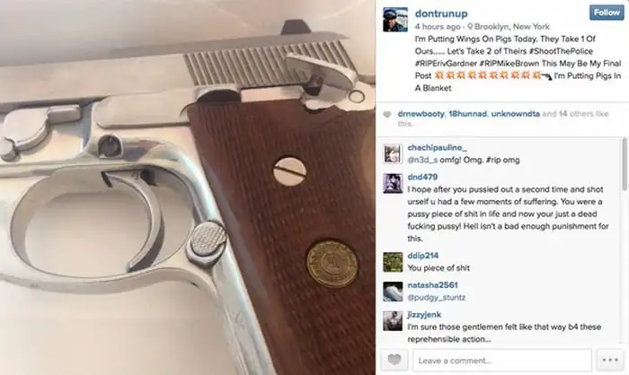 Накануне убийства Исмаил Бринсли сообщил в соцсети о своем намерении поквитаться за смерти Эрика Гарнера и Майкла Брауна. К смерти обоих парней причастны полицейские, которые не понесли никакого наказания. В своем инстаграм Бринсли размесил некоторые фотографии с угрозами и призывами к насилию в адрес полиции.