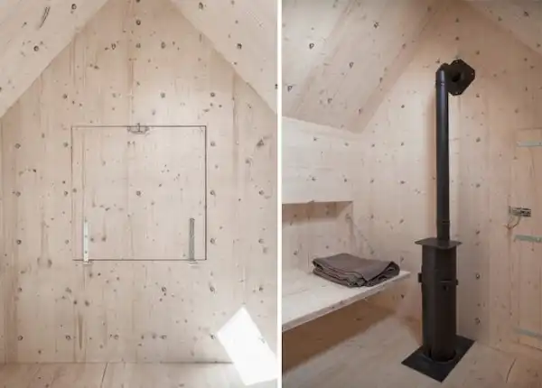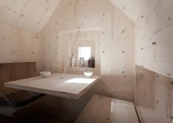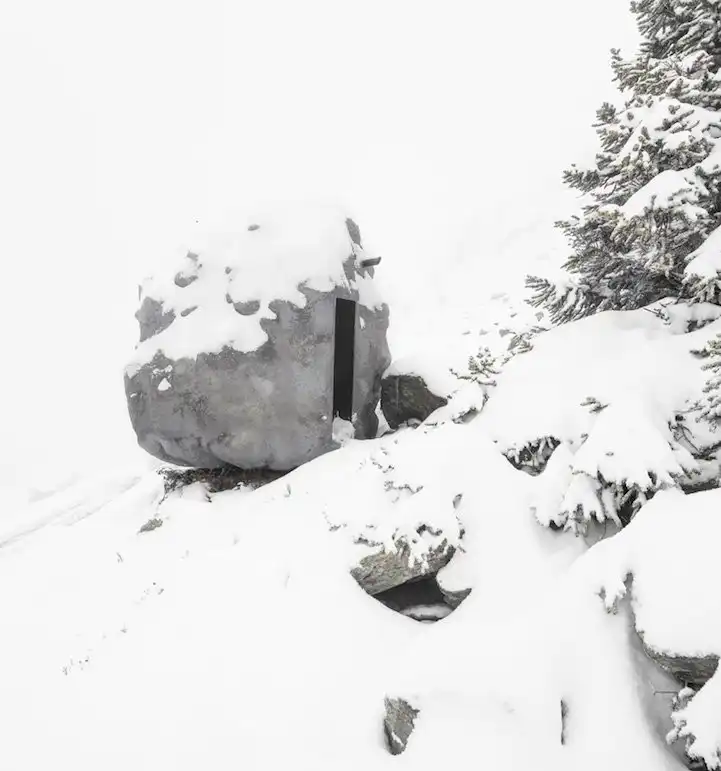 Архитектурная студия Bureau A создала домик, который сливается с альпийским пейзажем Швейцарии. Внутри домика есть все, что нужно для отдыха: кровать, раскладной стол, стул, камин. Вся внутренняя поверхность – из дерева, а снаружи – бетонный камень.
