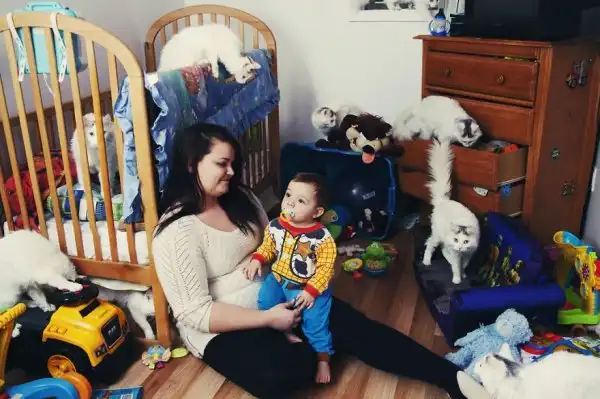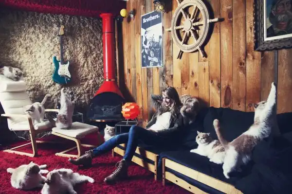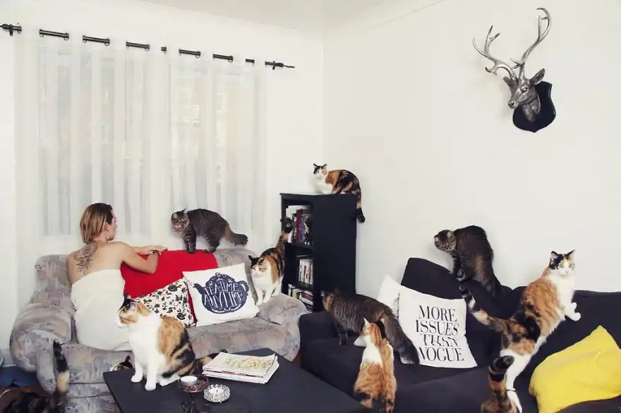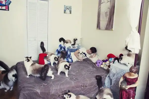 Андреан Лупен (Andreanne Lupien) с помощью ретуши в Фотошопе показал, как выглядят сумасшедшие кошатники в разных социальных слоях и разных странах мира. На всех работах изначально находились один или два кота, которые затем были добавлены в огромном количестве в жилое пространство.