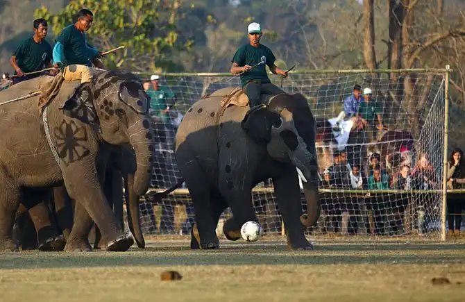 На спине каждого многотонного игрока сидел тренер, который управлял большим четвероногим зверем, однако удары по мячу наносили не люди, а слоны. В ходе матча под радостные крики зрителей было забито несколько голов.
