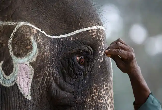 Каждого слона готовят к празднику, разрисовывая его кожу цветными мелками.
