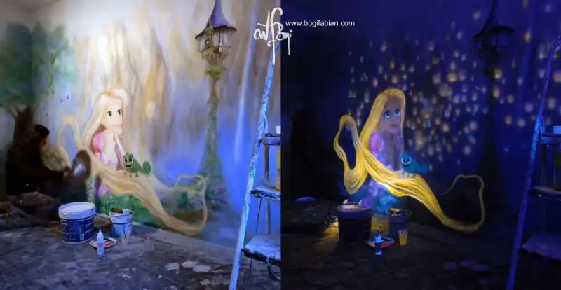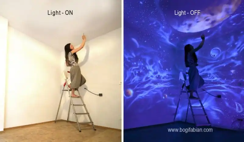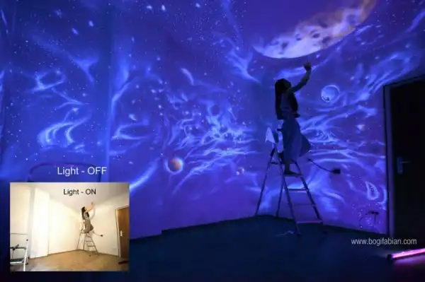 Боги Фабиан — необычная художница, занимающаяся настенной росписью. Большинство ее рисунков при дневном свете не представляют из себя ничего особенного. Зато, когда комната погружается в темноту, вы оказываетесь в новом и совершенно волшебном мире. Дело в том, что она создает свои рисунки с помощью специальных фосфоресцирующих красок.