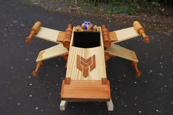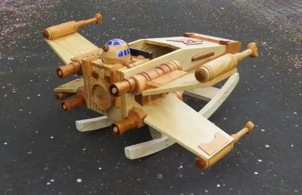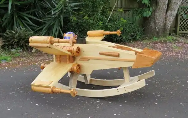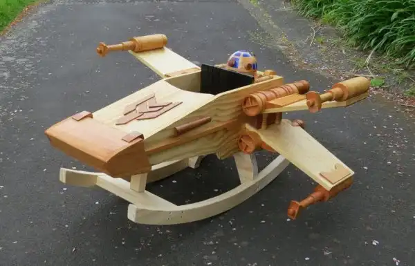 Эта деревянная качалка ручной работы от новозеландского магазина Steve's Wooden Toys представляет собой миниатюрную копию космического истребителя X-Wing из культовой саги "Звездные войны". Качалка изготовлена в единственном экземпляре и включает в себя даже съемного "второго пилота" — робота R2-D2.