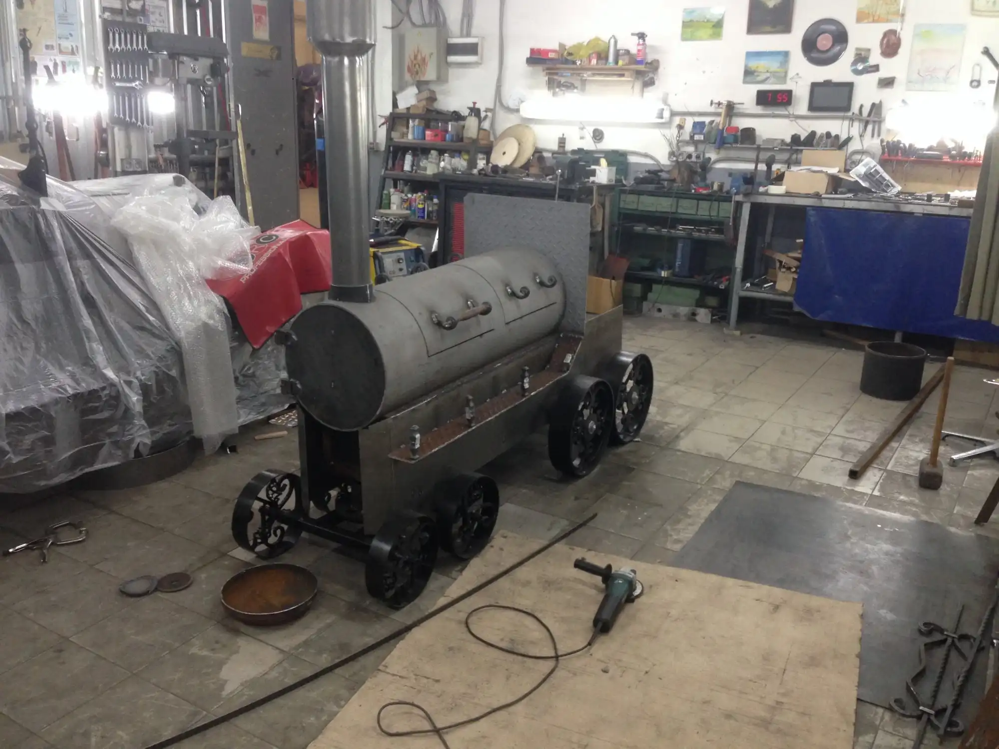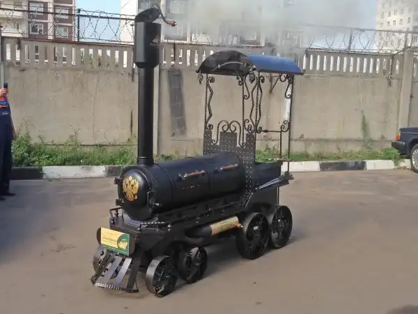 Перед юбилеем шефа, мы долго обсуждали, что же ему подарить и решили, что лучший подарок - сделанный своими руками. Идея создания барбекю в виде паровоза была почерпнута из интернета, но весь вид и оригинальную конструкцию придумали сами. Сроки - две недели. В основном над проектом работали два - три человека. Под котел паровоза отрезали кусок магистральной трубы. Под колеса - разрезали газовый баллон ( не пытайтесь повторить дома - опасно для жизни! ). Элементы ковки были куплены в Леруа. Дружная работа нашего коллектива увенчалась успешным завершением, и естественно, мы как создатели, решили испытать наше творение. Результаты превзошли все ожидания: паровоз, оснащенный регулировками поддува и вытяжки, великолепно и быстро прожарил колбаски и шашлыки, которые мы с аппетитом съели. После этого подарок был торжественно вручен юбиляру.