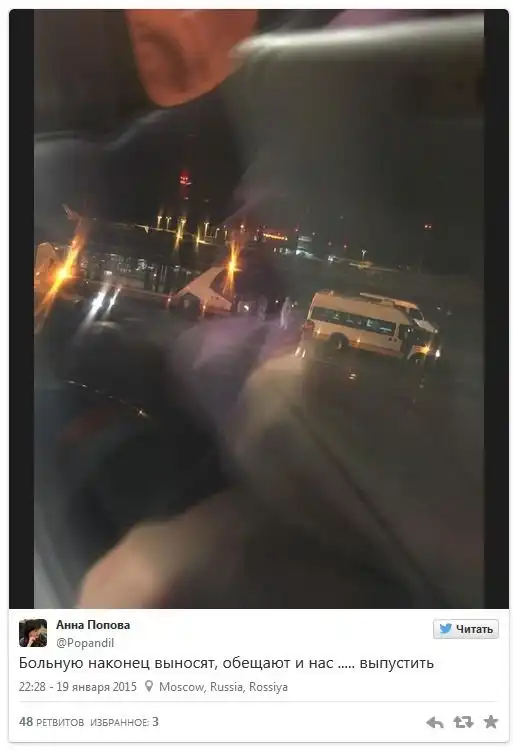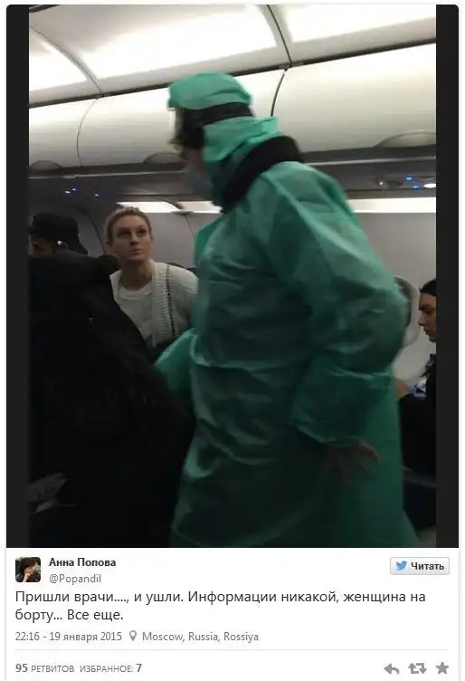 21-летнюю француженку проверяли на опасный вирус, в то время как самолет со 188-ю пассажирами находился на отдельной стоянке. Опасения экипажа не подтвердились, девушке диагностировали ОРВИ. Чтобы полностью исключить возможность лихорадки Эбола, девушке оформили временную визу и поместили в одну из московских клиник.