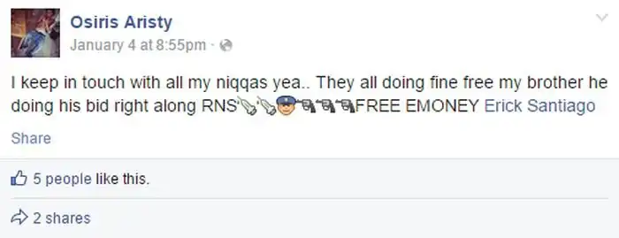 Юный житель Бруклина считается проблемным подростком, так как на его счету уже 12 арестов, в том числе за ограбление, незаконное хранение оружия и нападение на человека. Полиция внимательно следит за аккаунтом Осириса в соцсети и недавно обнаружила несколько записей со смайликами, часть из которых считают террористической угрозой. В одном из сообщений на голову полицейского были направлены три пистолета. Были и другие подобные записи, но их владелец страницы удалил.