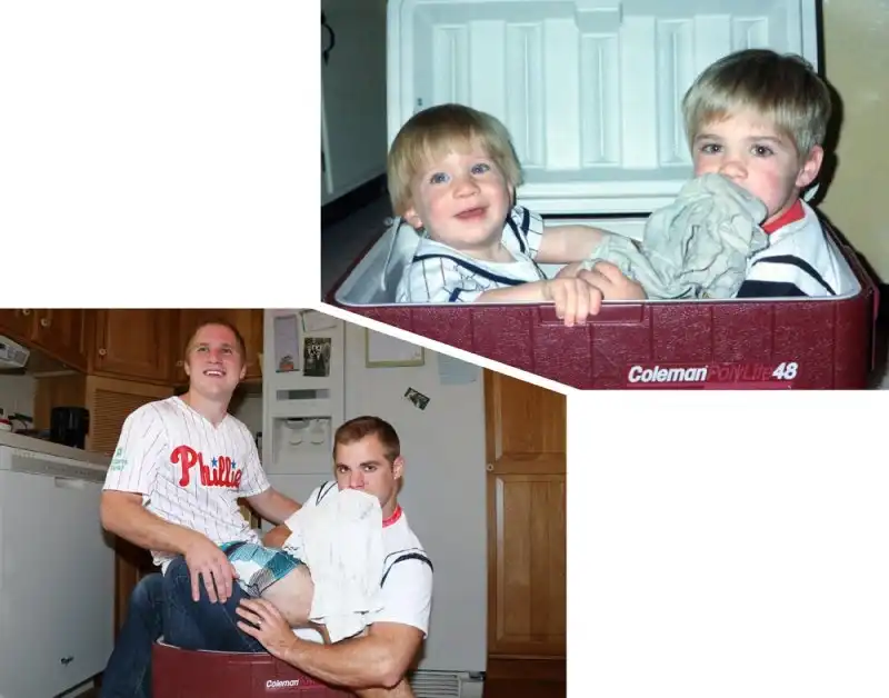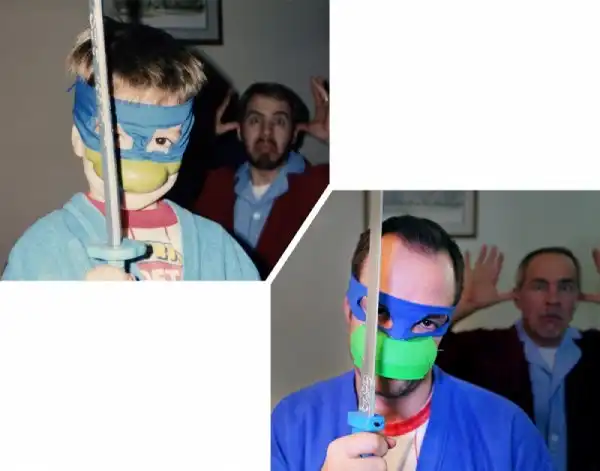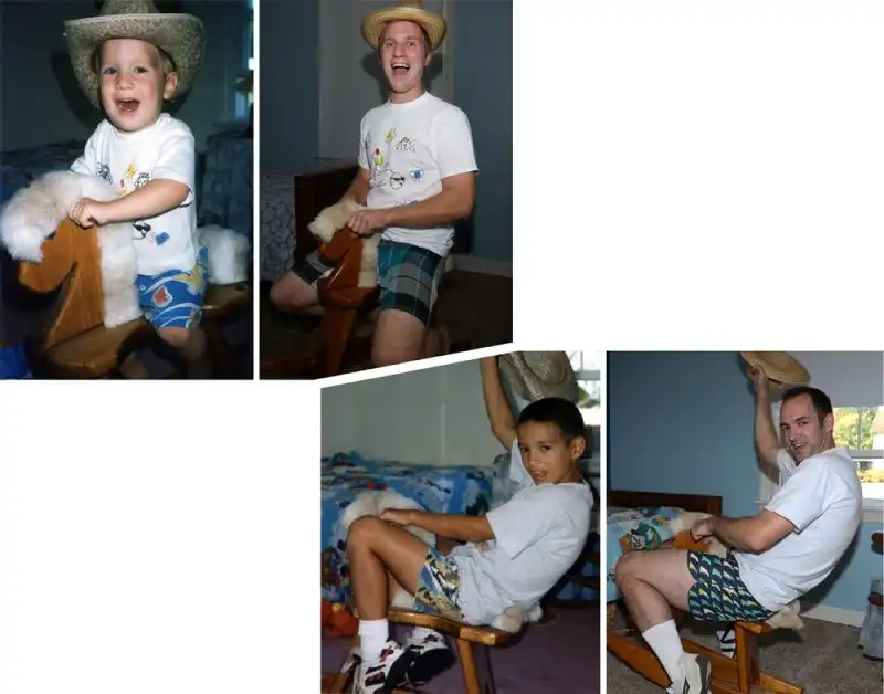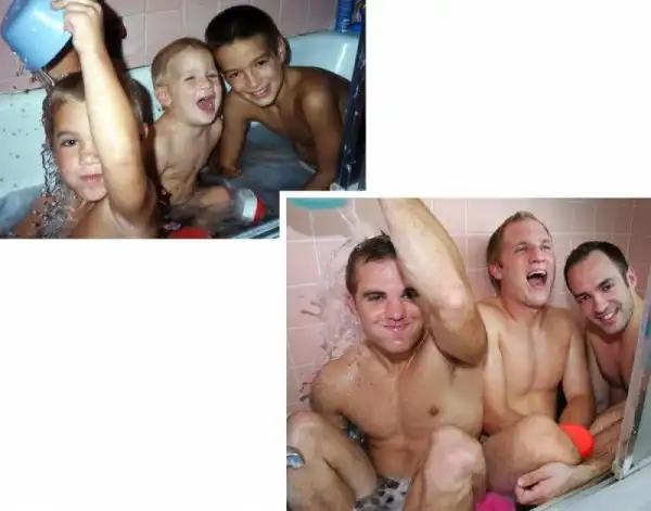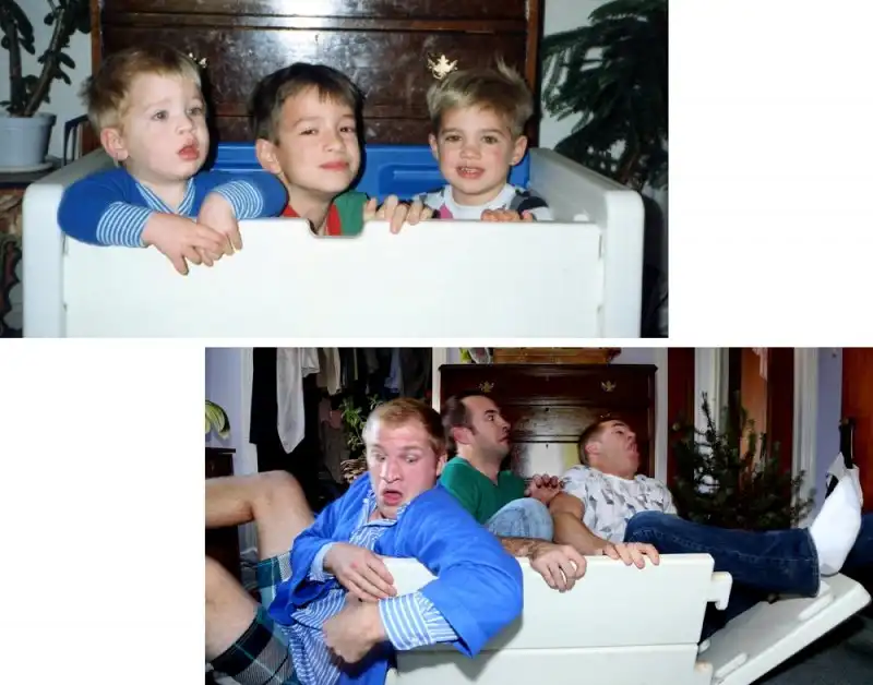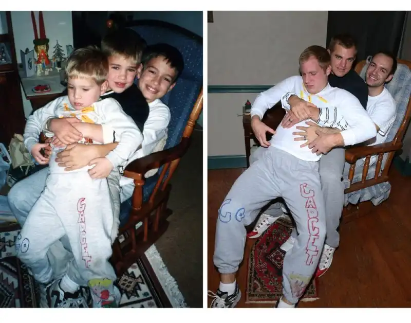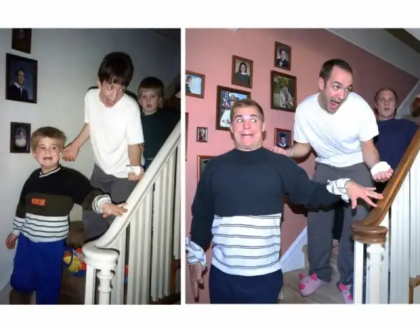 Три брата решили сделать необычный, но очень приятный подарок своим родителям к их годовщине свадьбы - ребята воссоздали свои детские снимки, будучи взрослыми. Забавно наблюдать, как уже взрослые дяди делают нетипичные для своего возраста вещи, но это чертовски мило, а главное этот подарок станет незабываемым для их родителей.