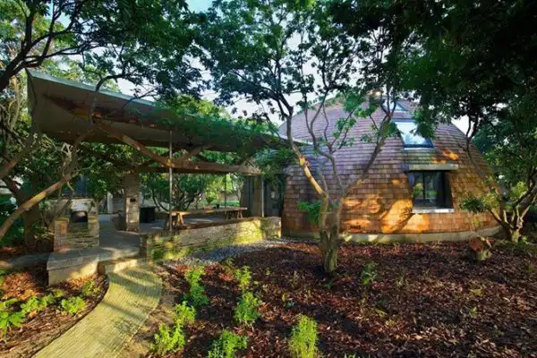 Особенность дома-купола состоит в том, что он лишен несущих опор и стен в прямом их понимании. Вся нагрузка приходится на сам купол. Кстати, он построен из специального дерева. Вся мебель была специально заказана, с учетом круглого внутреннего пространства, чтобы не создавалось впечатления инородности интерьера. Однако, главной задачей подобного проекта, считает Тимоти Аултон (Timothy Oulton), создание уникального места, где гармония во всем будет подталкивать дизайнера на новые творческие достижения.
