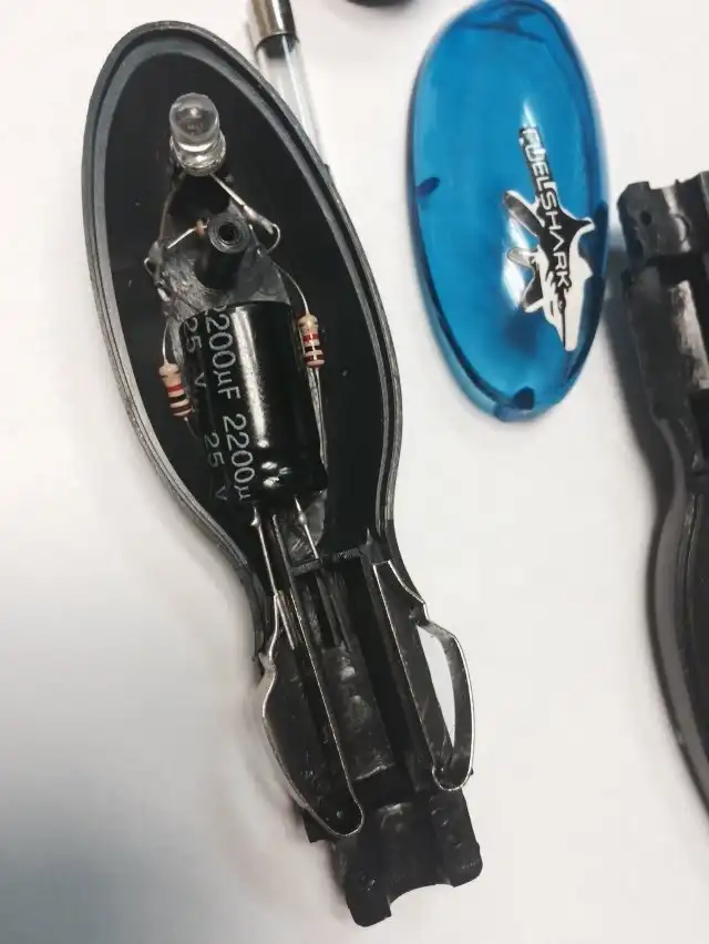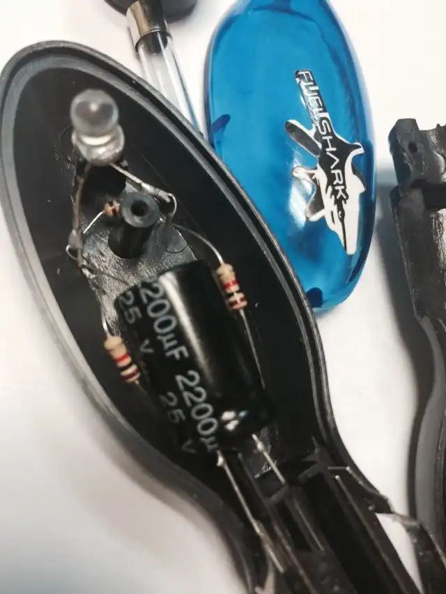 При разборе видно что кроме конденсатора и светодиода там ничего нет,еще какие то детальки.Но ,возможно,если конденсатор расчленить то внутри окажется что то типа адронного коллайдера или урановой центрифуги,я не стал его "препарировать".