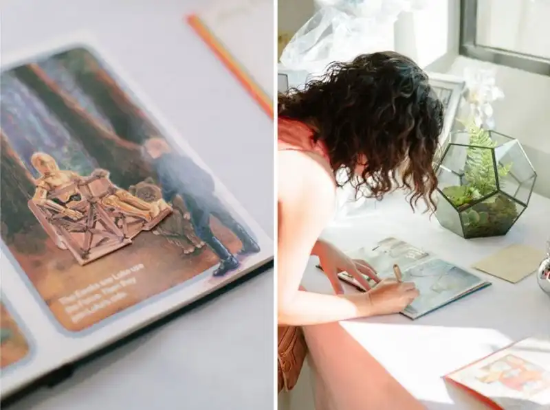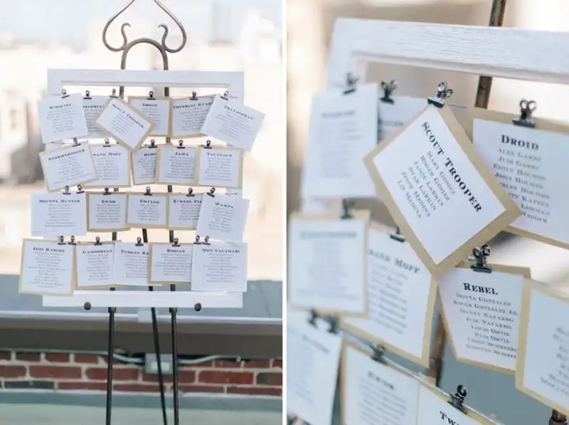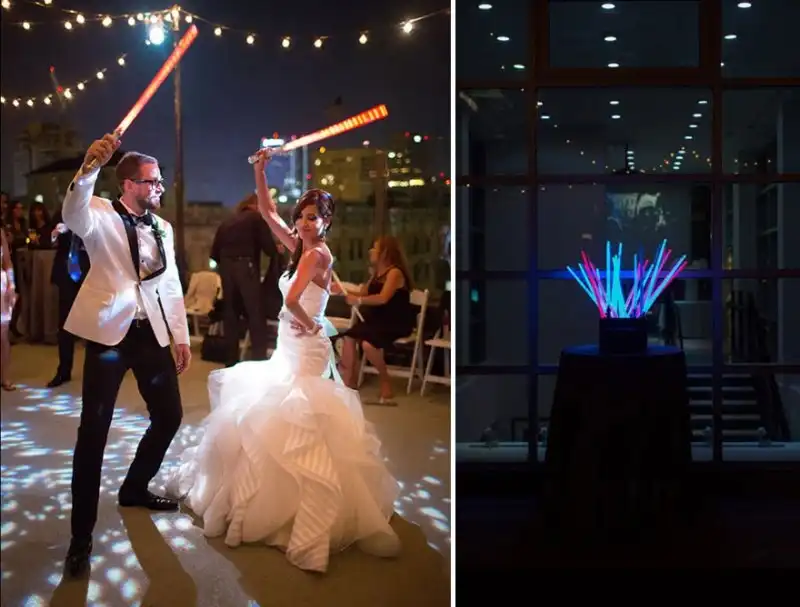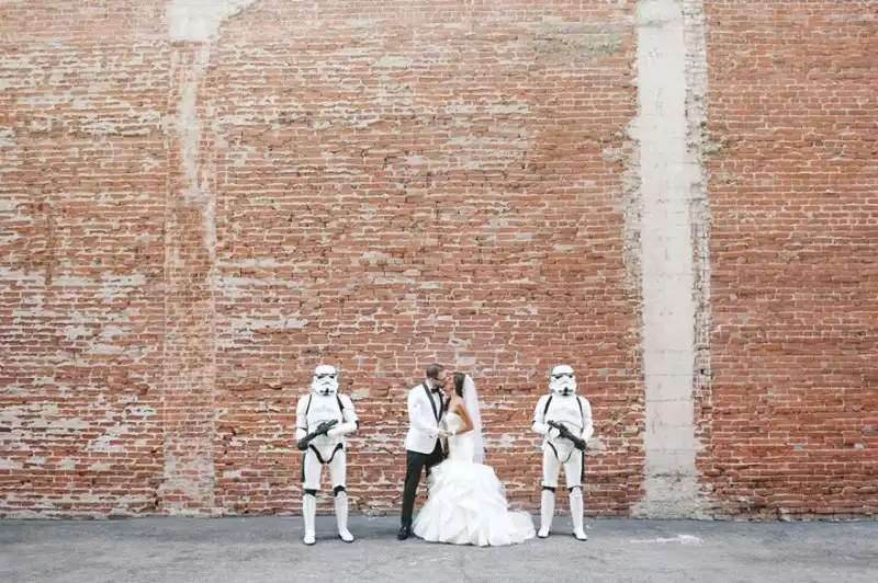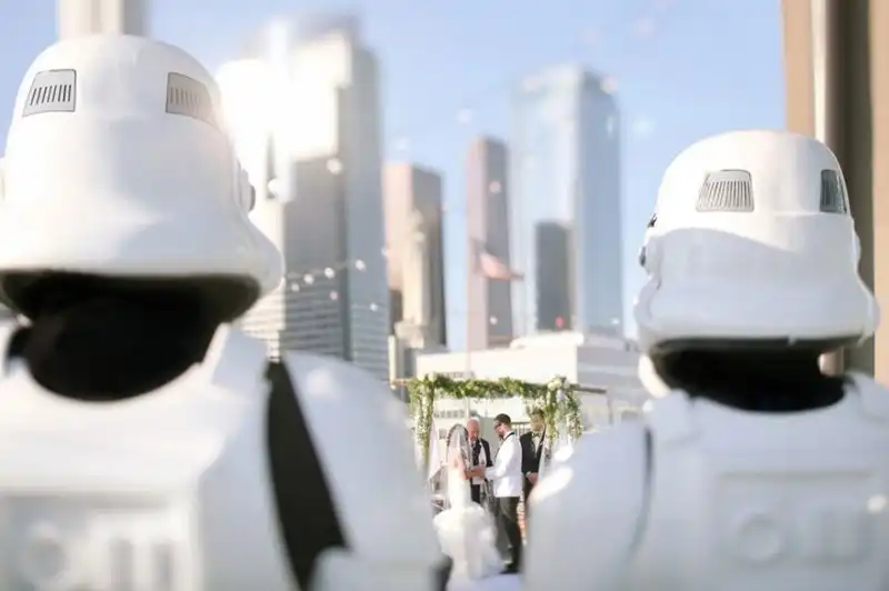 Джошуа и Дженнифер, давние поклонники "Звездных войн", решили сыграть свадьбу в стиле культовой фантастической саги. Гостей праздника встречали и развлекали имперские штурмовики, свадебный торт украшали световые мечи, а столы гостей имели следующие названия: дроиды, повстанцы и Тви'леки. А отец невесты для танца даже облачился в костюм Дарта Вейдера.