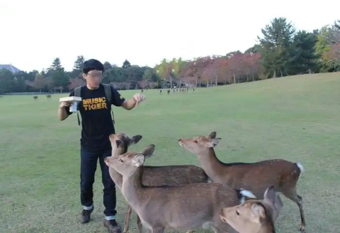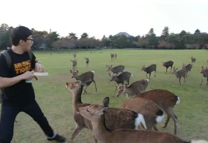 Этот парень решил покормить нескольких косуль, но не подозревал, что остальные члены группы тоже заинтересуются его угощением.