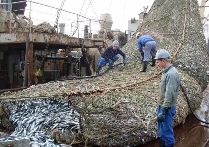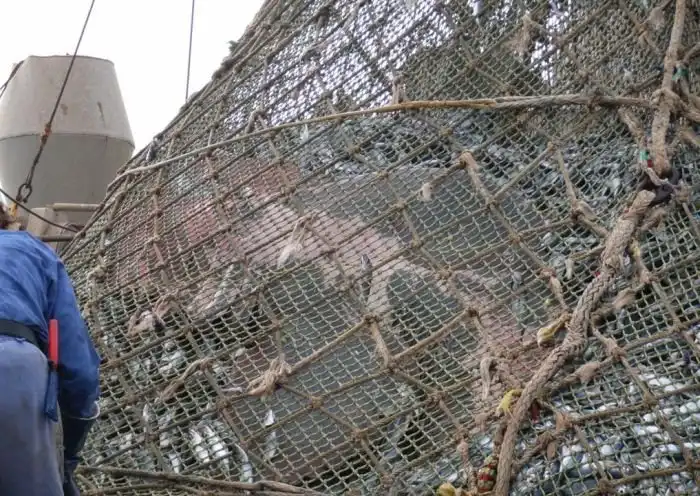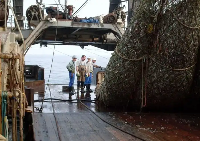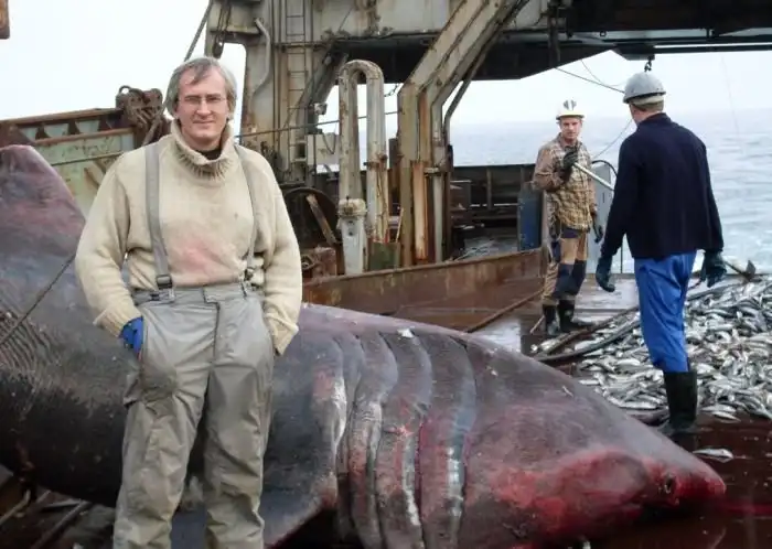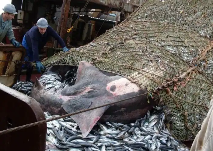 Иногда в сети рыболовных траулеров вместе с обычной промысловой рыбой попадают и более экзотические виды рыб. Например, команде этого судна посчастливилось выловить большую акулу, которая, как и тысячи других рыб запуталась в снастях.