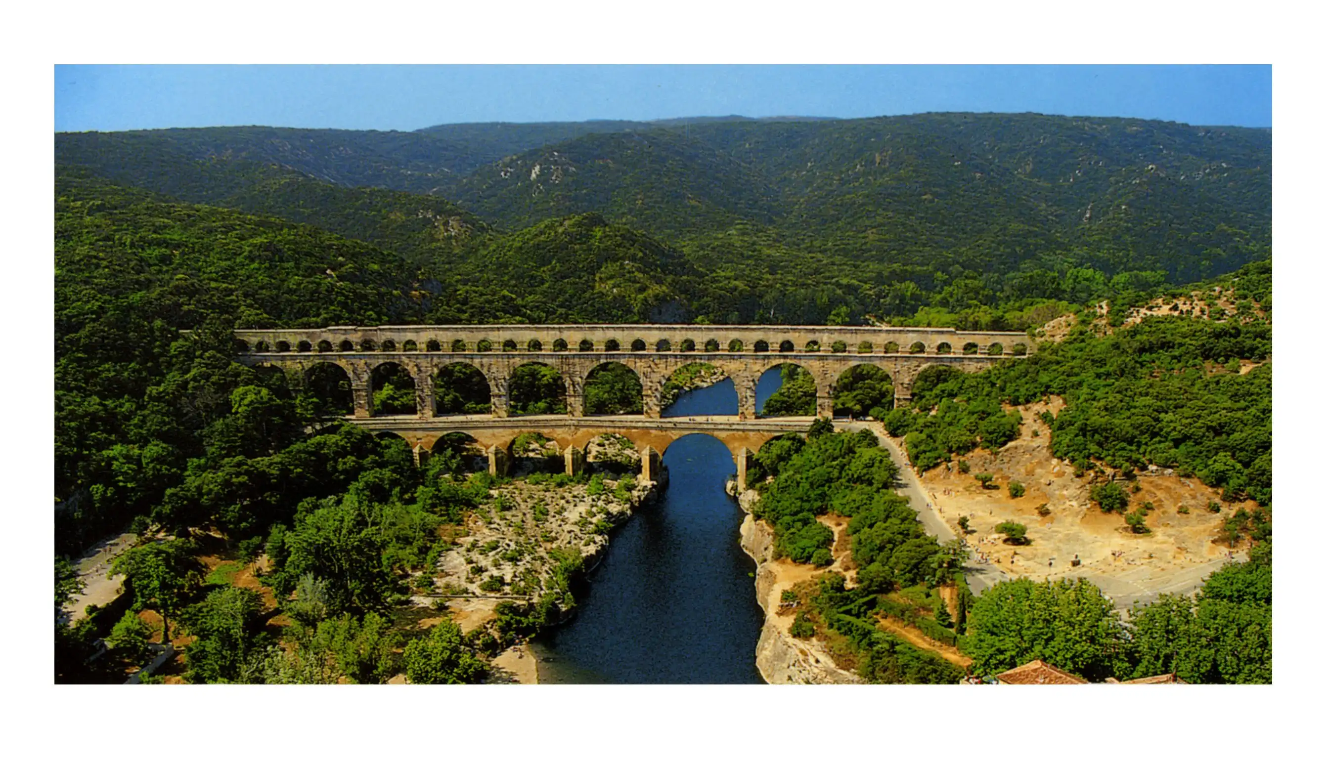 Мост дю Гар, бывший древнеримский акведук, перекинутый через бурную реку, поражает масштабностью и качеством строительства. Римляне считали его лучшим доказательством величия Империи. Три яруса арок, высота – 49 метров (самый высокий построенный римлянами мост), 6-тонные каменные блоки… Срок службы при строительстве определялся в 400-500 лет. Сооружению, возведённому над стремительной горной рекой уже две тысячи лет, а всё ещё стоит… Причём мало кто задумывается над тем, что две тысячи лет назад римские инженеры не просто построили качественный мост, но в горной местности проложили водовод, и вода шла самотёком через мост-акведук на десятки километров, снабжая водой близлежащий город Ним. Я к тому, что чтобы вода шла самотёком по открытому водоводу в горах и равнинах на многие километры, надо было сделать кучу работы по топосъёмке на пересечённой местности, и рассчитать общий многокилометровый уклон сооружения, составляющий всего несколько сантиметров. Титаническая работа во славу Империи и для обеспечения комфортной жизни граждан даже отдалённых провинций. Техническое совершенство и качество инженерной работы двухтысячелетней давности вызывает восторг и уважение.
