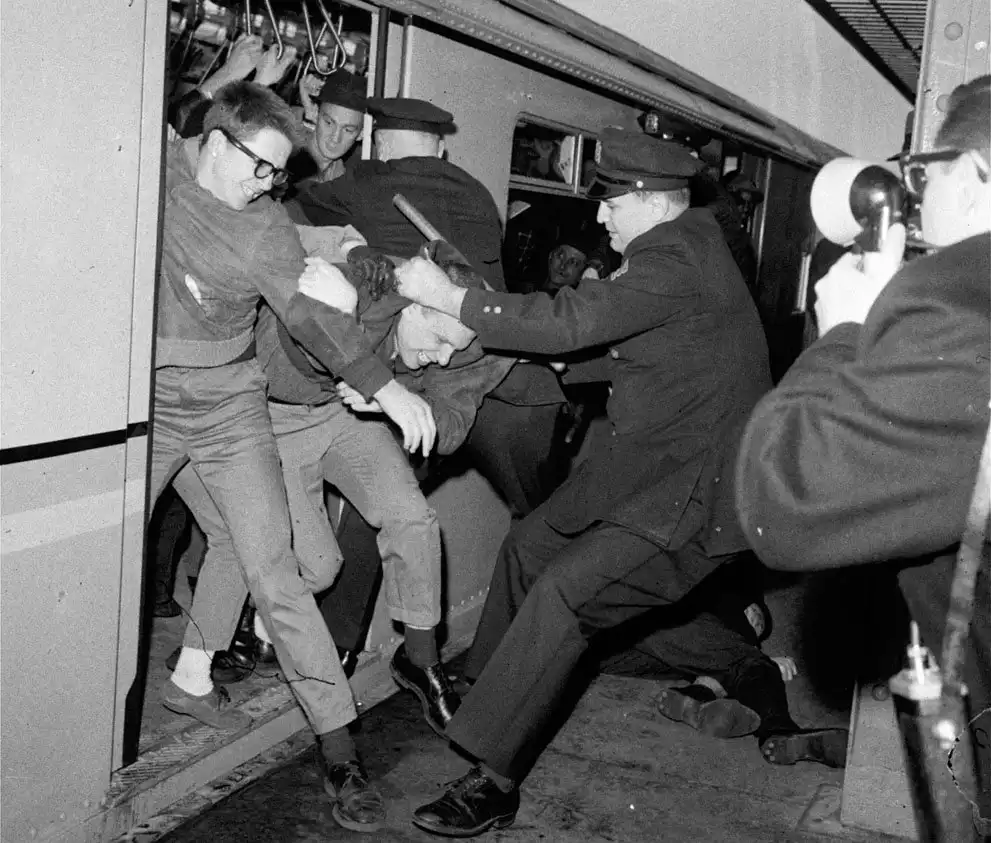 Нью-Йорк, конфликт полицейских с демонстрантами на станции метро в день открытия Нью-Йоркской Всемирной выставке, 22 апреля 1964 года. Юноши в качестве формы протеста за гражданские права чернокожих пытались остановить поезд, который ехал из города в торгово-выставочный центр. (AP Photo / Charles Gorry)