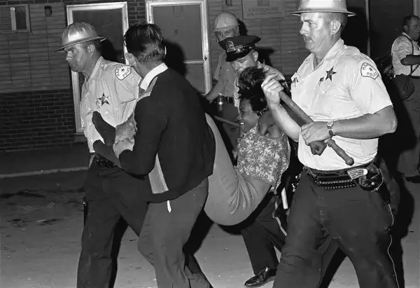 Женщину, задержанную за протесты в Dixmoor, IL, 17 августа 1964 года, несут в полицейский фургон. Полиция наводила порядок разгоном участников «чёрных» протестов, если не принималось решений брать их под стражу. Всего же в беспорядках в Диксморе, пригороде Чикаго, более двенадцати человек были арестованы. В ряде крупных городов по всей восточной части США также прошла серия беспорядков тем летом 1964 года. (AP Photo)