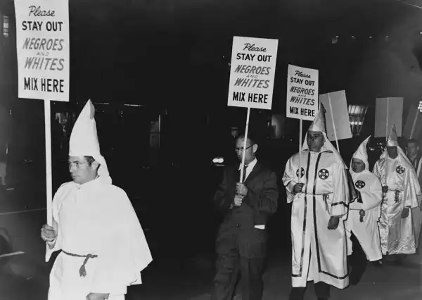 Несколько членов Ку-клукс-клана, большинство в белых одеждах и капюшонах без масок, несут плакаты, гласящие: "Пожалуйста, остановитесь, негры и полукровки, немедленно" (Библиотека Конгресса)