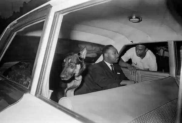 Эндрю Янг склонился к полицейской машине, чтобы поговорить с доктором Мартином Лютером Кингом-младшим, сидящим на заднем сиденье рядом с полицейской собаки, когда он возвращается в тюрьму в Санкт-Августине, штат Флорида, после дачи показаний перед большим жюри по расследованию расовых беспорядков в городе, 12 июня 1964 года. (AP Photo)