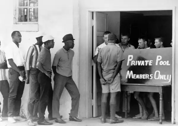Общественный бассейн сменил вывеску на "частный бассейн", чтобы оставаться раздельным, Каир, штат Иллинойс. (Дэнни Лион / Библиотека Конгресса)